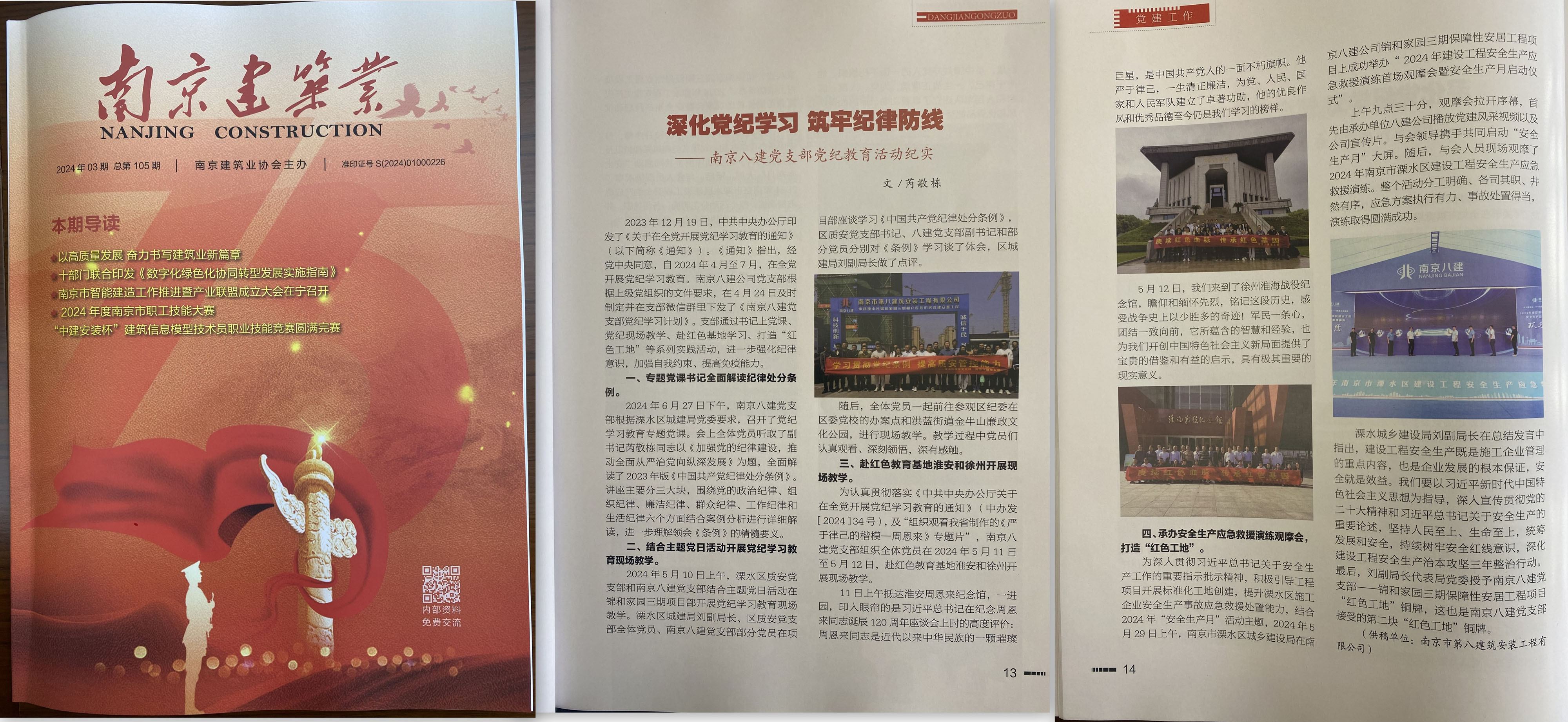 2024年9月,南京建筑業(yè)協(xié)會主辦的《南京建筑業(yè)》(第105期)刊登了芮敬棟同志《深化黨紀學習 筑牢紀律防線——南京八建黨支部黨紀教育活動紀實》一文 -